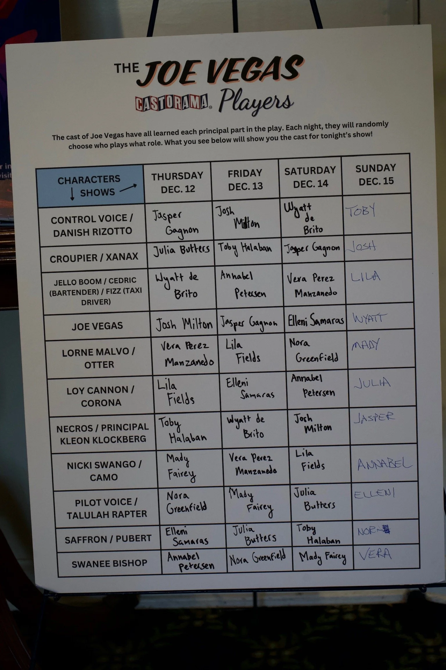 NOTE: Joe Vegas is presented in Cast-O-Rama, meaning the actors have learned every role in the play. They will be assigned a specific character randomly before each performance. There is no repeating, so they will play a new character each show.